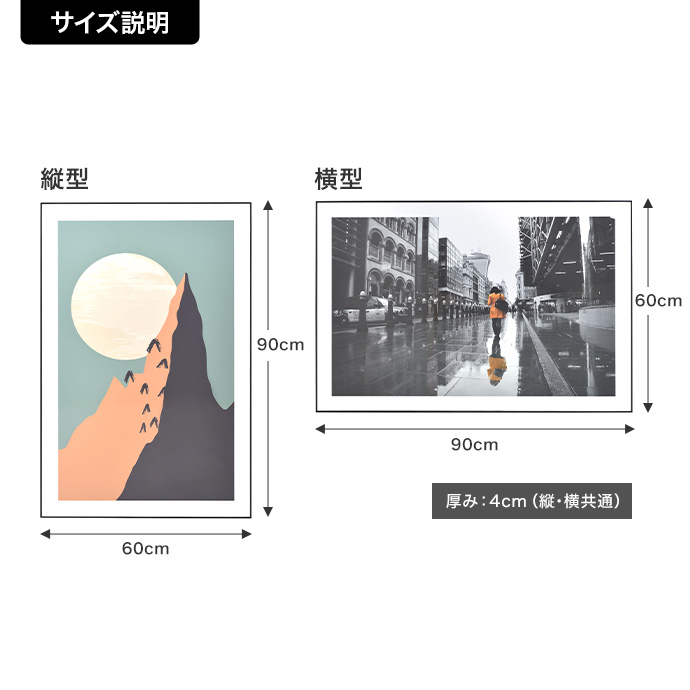 【縦型】幅60cm×奥行4cm×高さ90cm 【横型】幅90cm×奥行4cm×高さ60cm |