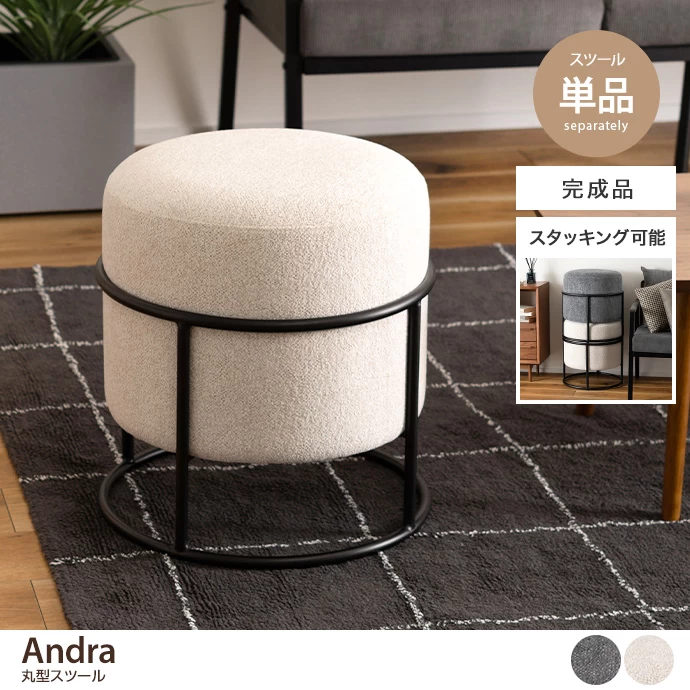 コロンとした丸型の座面と、シャープなブラックスチール脚の組み合わせが目を惹くスツール。座面は弾力のあるクッション性で、体重をしっかり支えつつ、やや硬めで立ち座りを快適に行えます。直径45cmの広々とした座面で、ゆったりと余裕のある座り心地を実現しました。またスタッキングが可能で、使わないときは省スペースにまとめられるため、すっきりとした空間を保てます。