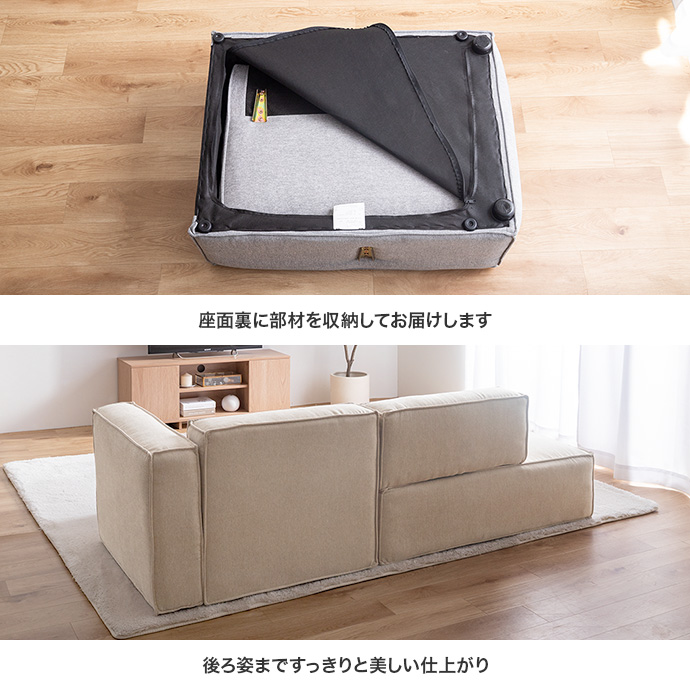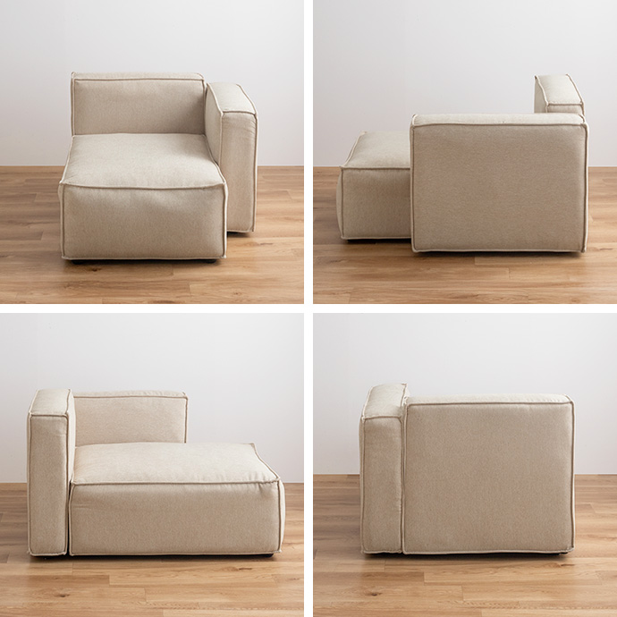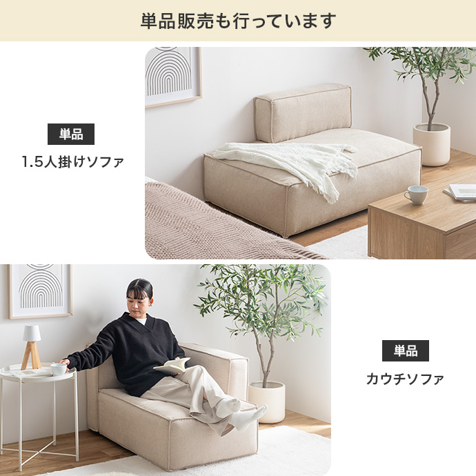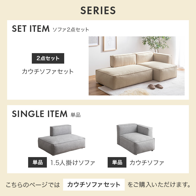 カウチソファと1.5人掛けソファの2ピースで、自由なレイアウトをお楽しみいただけます。2つを繋げれば広々カウチスタイルに、それぞれ離して置けば来客時にも便利なセパレートスタイルに。間取りやシーンに合わせて、最適な形でお使いいただけます。