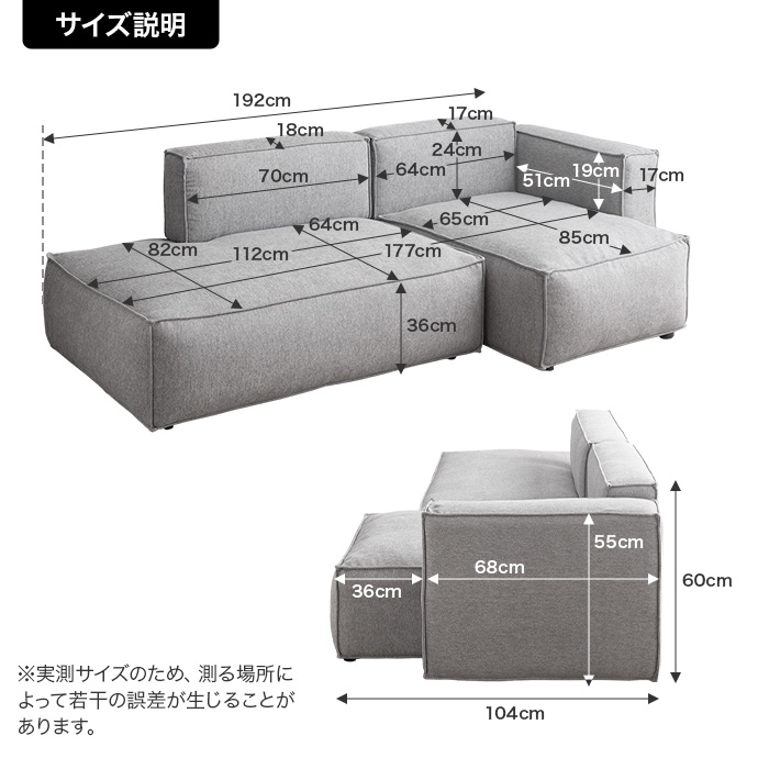 【1.5人掛けソファ】幅112cm×奥行82cm×高さ60cm(座面高:36cm) 【カウチソファ】幅80cm×奥行104cm×高さ60cm(座面高:36cm)