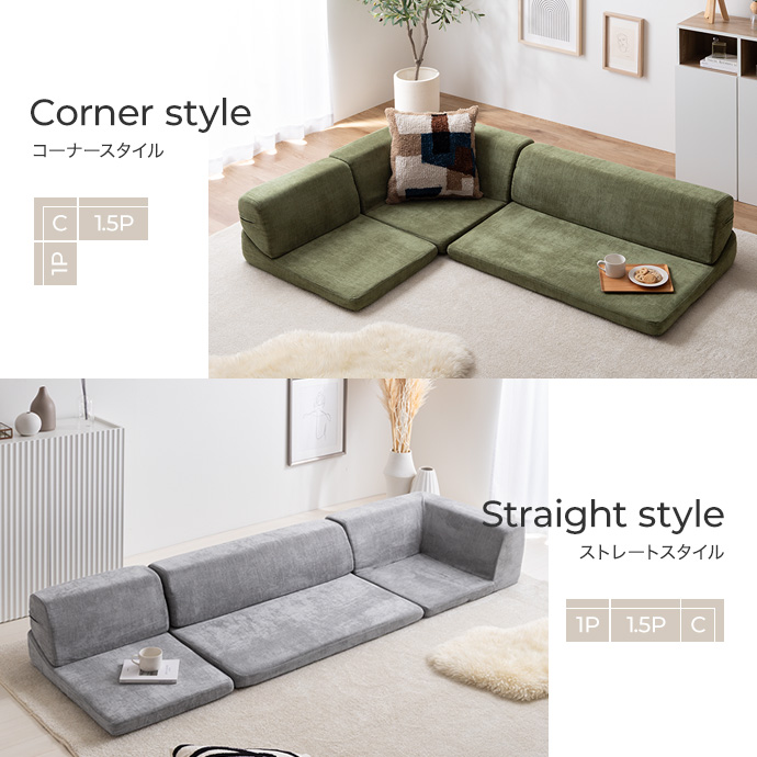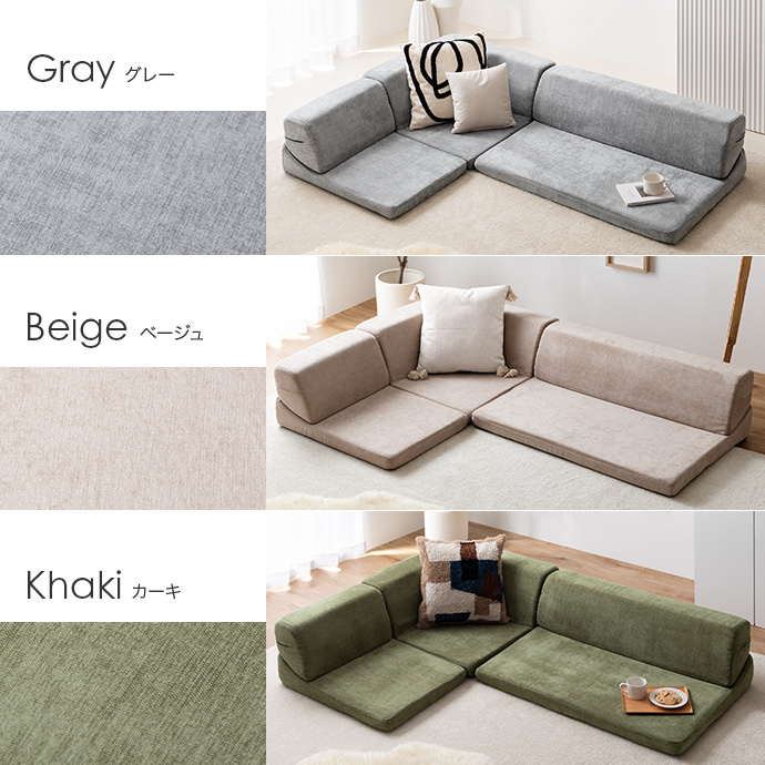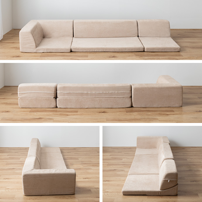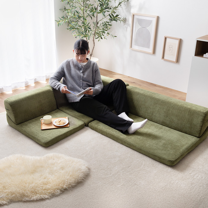 3ピースで自由にレイアウトできるフロアソファは、気分やシーンに合わせて形を変えられるのがとっても便利♪やわらかい座り心地とリクライニング背もたれで、くつろぎ時間がもっと快適になります。しかも圧縮梱包で届くから、狭い玄関や通路でも搬入らくらくです!