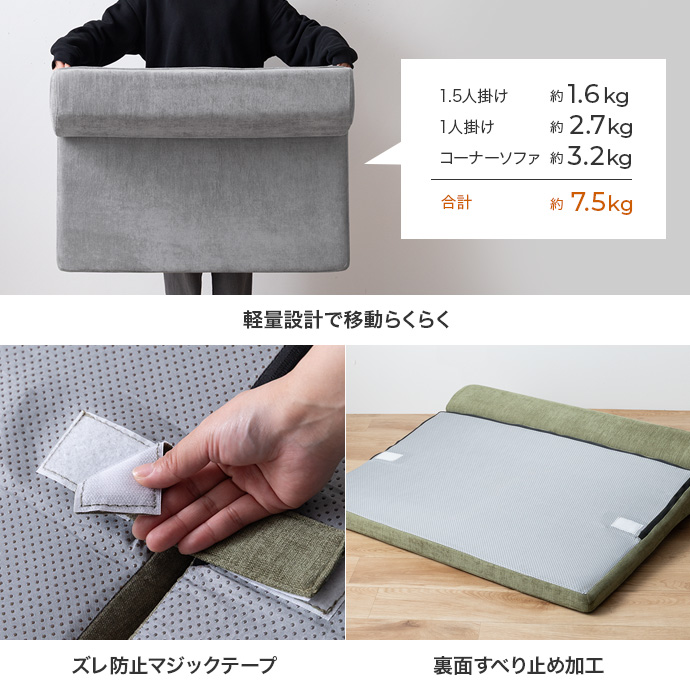 商品重量 【1.5人掛け】約1.6kg、【1人掛け】約2.7kg、【コーナーソファ】約3.2kg