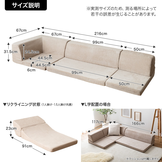 1.5人掛け:幅99cm×奥行67cm×高さ31.5cm(座面高:6cm) 1人掛け:幅50cm×奥行67cm×高さ31.5cm(座面高:6cm) コーナー:幅67cm×奥行67cm×高さ31.5cm(座面高:6cm)