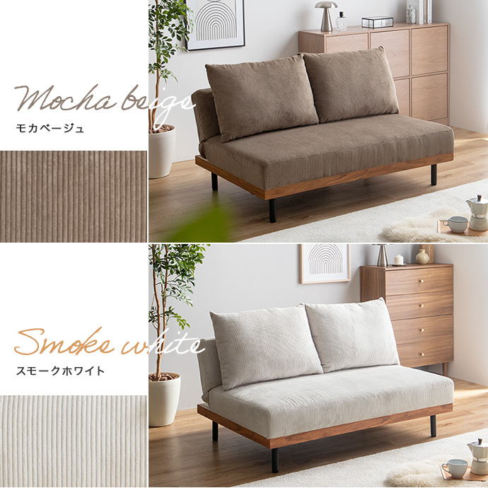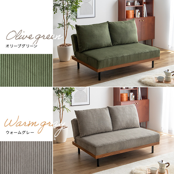 コーデュロイ×木目柄×アイアンの異素材MIXが味わい深いリクライニングソファ。コーデュロイの優しい肌触りと心地よい弾力のクッション、楽な姿勢に調整できる3段階リクライニングで、快適なくつろぎタイムを叶えます。あぐらもかける広々座面ながら、脚も取り外せるロー設計なので圧迫感が少なく、ワンルームなどのスペースに余裕のないお部屋にもピッタリ。また、2脚揃えるとソファベッドになり、友人や家族が泊まりに来た時用の簡易ベッドや、足をのばしてくつろぐゆったりソファとしても大活躍します。