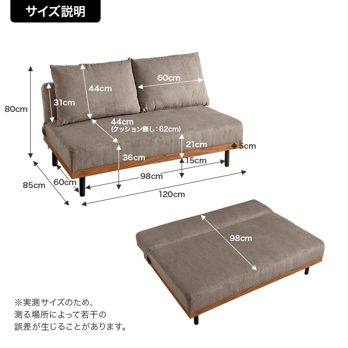 【ソファ時】幅120cm×奥行85cm×高さ80cm(座面高:36cm) 【ベッド時】幅120cm×奥行98cm×高さ36cm