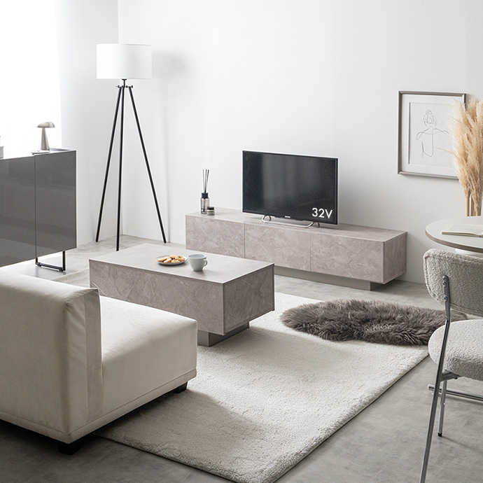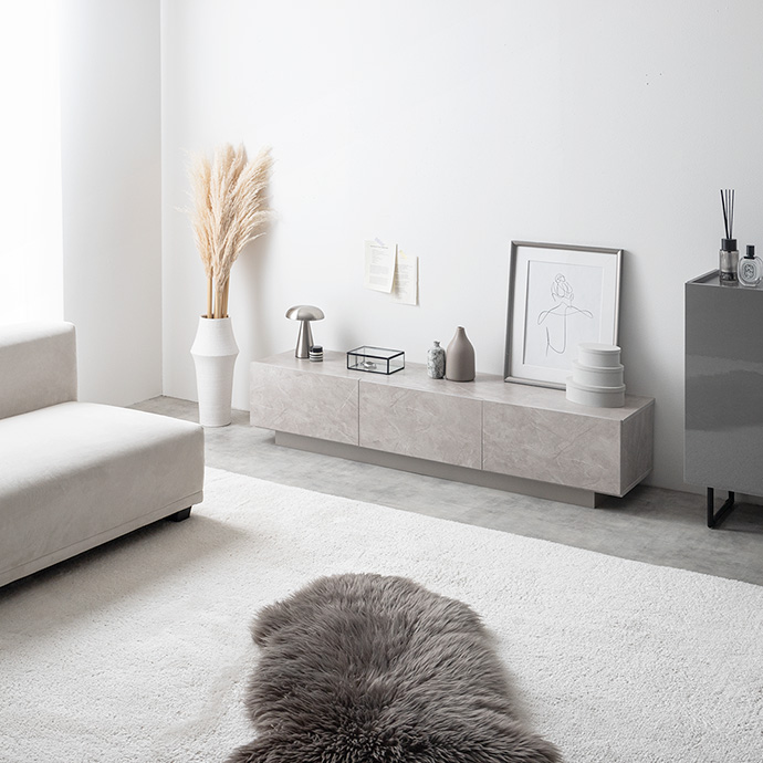 高級感溢れるストーン柄のテレビ台。ノイズレスデザインが視線の集まるテレビ周りを整え、ワンランク上の洗練された空間を演出します。またロータイプのためお部屋に圧迫感を与えず広く見せることが可能です。さらに3タイプの収納や配線タップ置きを設置し、使いやすさにもこだわりました。