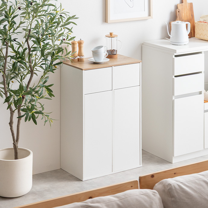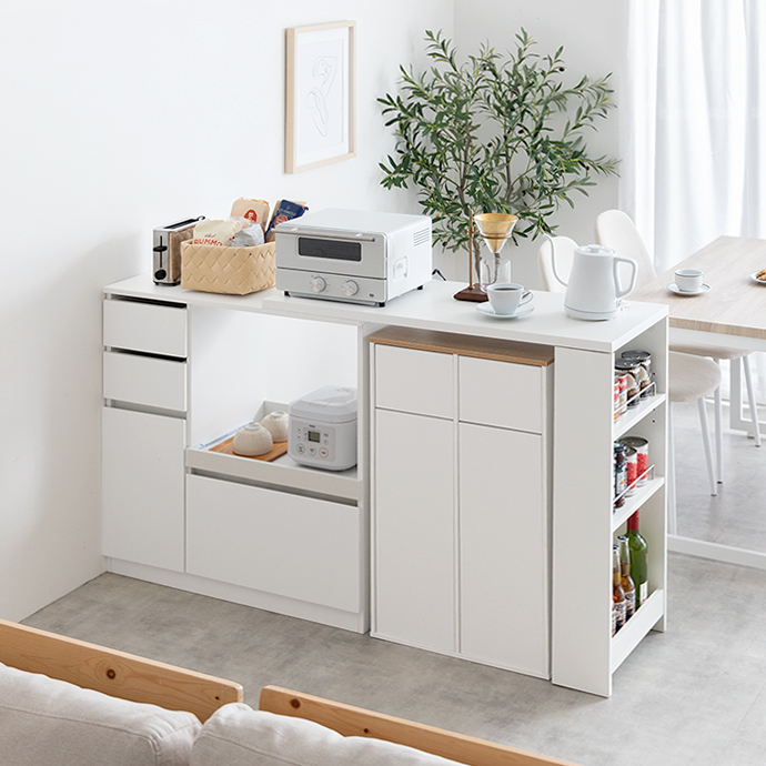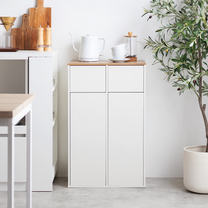 天板は、ディスプレイをしたりキッチン雑貨を置くのにピッタリ。植物やお気に入りの物を飾ったり、調味料や食品ストックなどキッチン周りで必要な物を置くにも適しています。また耐荷重は約15kgあり、トースターやケトルなどちょっとしたキッチン家電を置くのにもおすすめです。