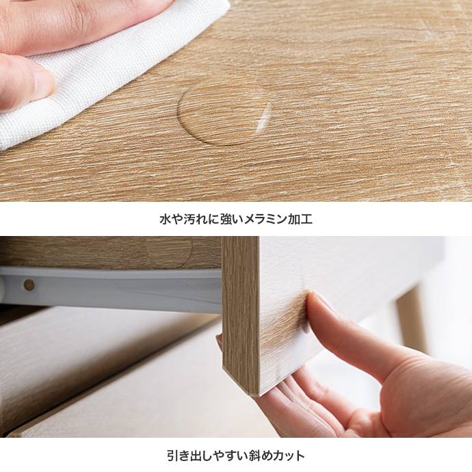 細々した物から背の高い物まで、まとめて収納できるチェスト。上2段の浅型引き出しには化粧品やアクセサリーなどの小物を用途別に、最下段の深型引き出しにはボトル類やドライヤー、美容家電、本などまとめて収納可能。スライドレール採用で、たっぷり入れても軽い力で開閉いただけます。