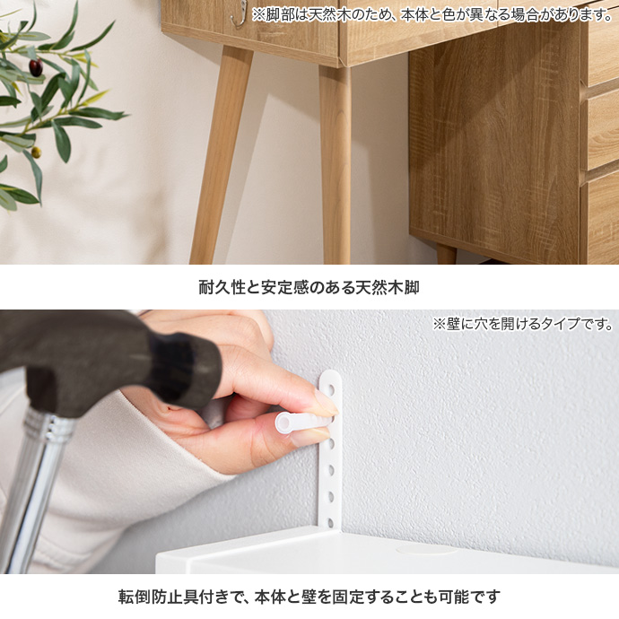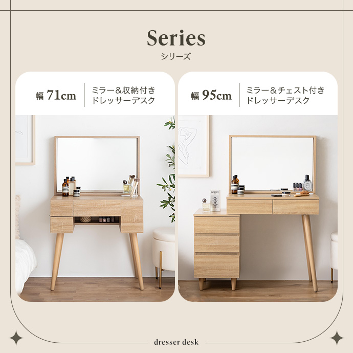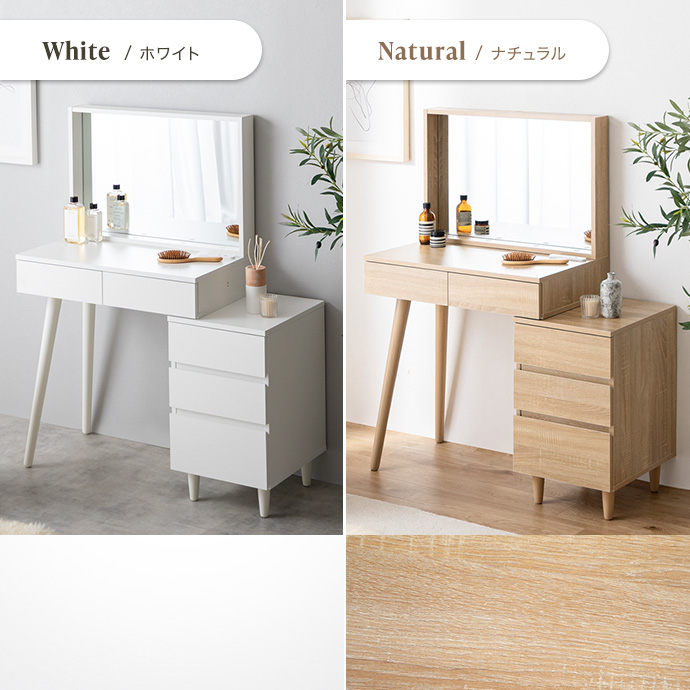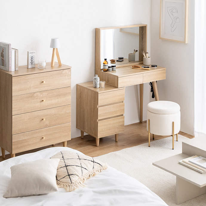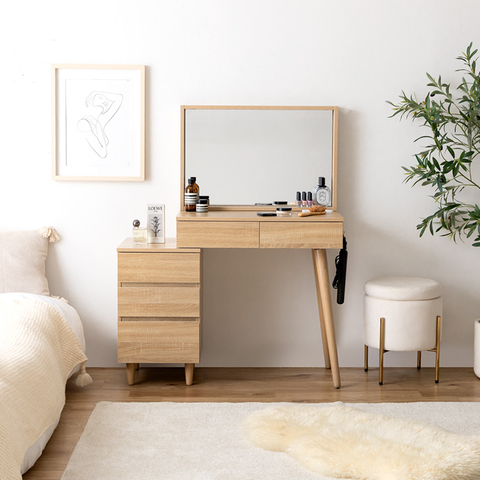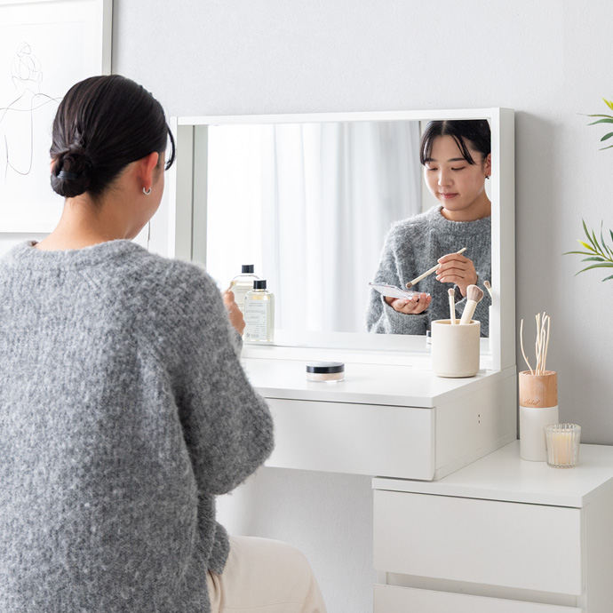 毎日のお出かけ準備を快適にするため、使いやすさをとことん追求。上半身がしっかり映る大きなミラーに、作業スペースたっぷりの広々天板。コスメやボトルを収納できる5杯のサイズ違いの引き出しで、いつでもお部屋をすっきり魅せます。