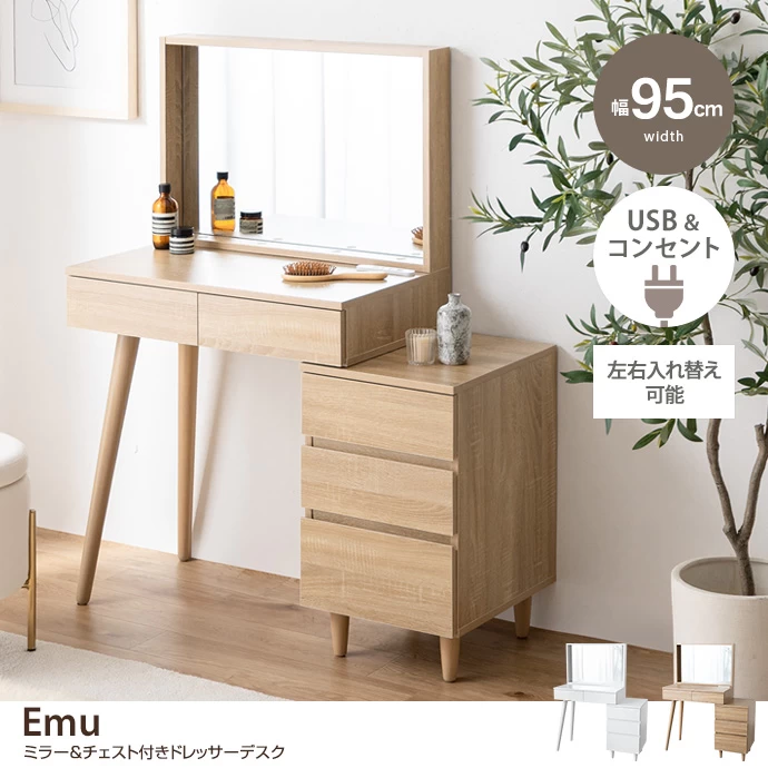 Emu エミュ 幅95 ドレッサー 鏡台 デスク テーブル 化粧台 化粧机 メイク台 おしゃれ おすすめ 安い コンパクト チェスト付き 大容量 収納 鏡 ミラー コスメデスク コンセント USBポート 小さい 引き出し 5杯 サイドフック 一面鏡 木目調 一人暮らし ワンルーム リビング 寝室 かわいい