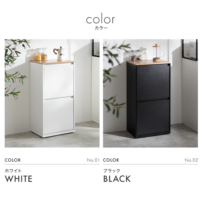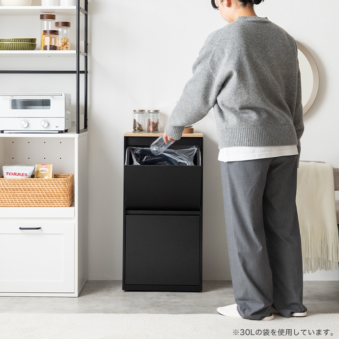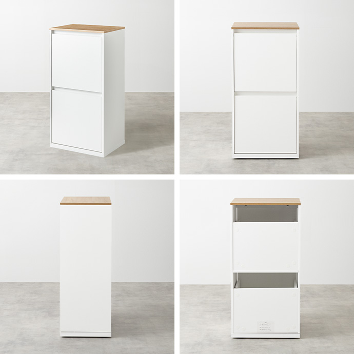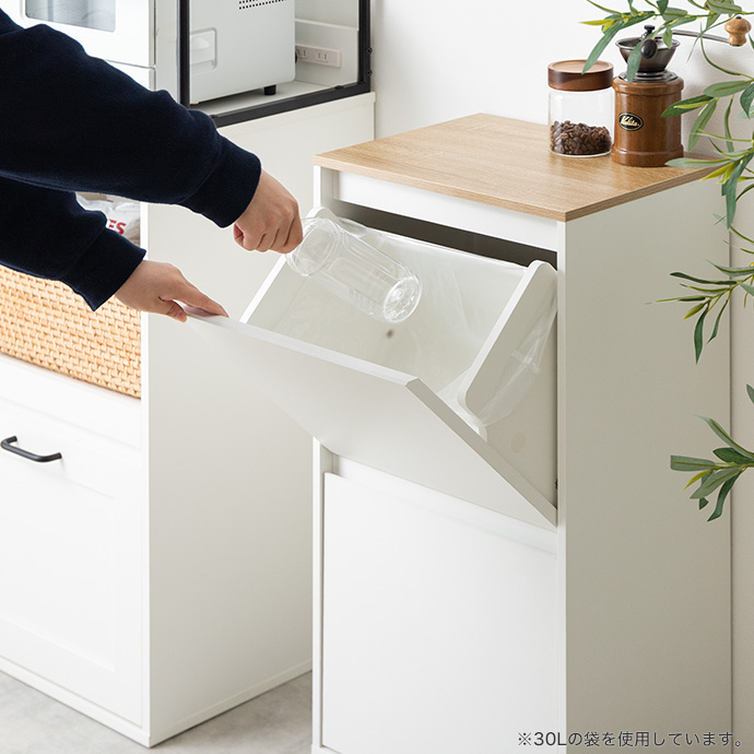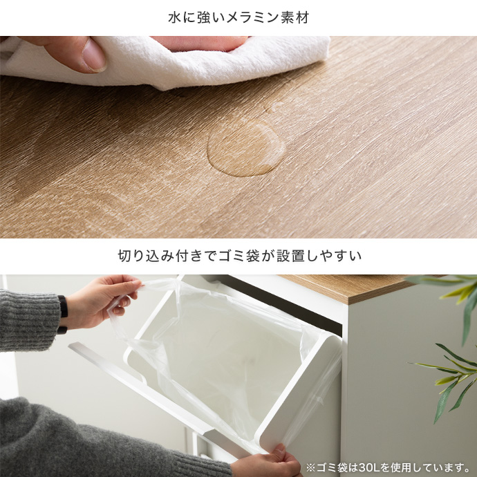 上下二段に分かれた構造で、ゴミを種類ごとに分けて捨てられます。あらかじめ分別しておけるため、回収日もそのままスムーズにゴミ出しが可能。キッチン周りをすっきり整えながら快適にお使いいただけます。