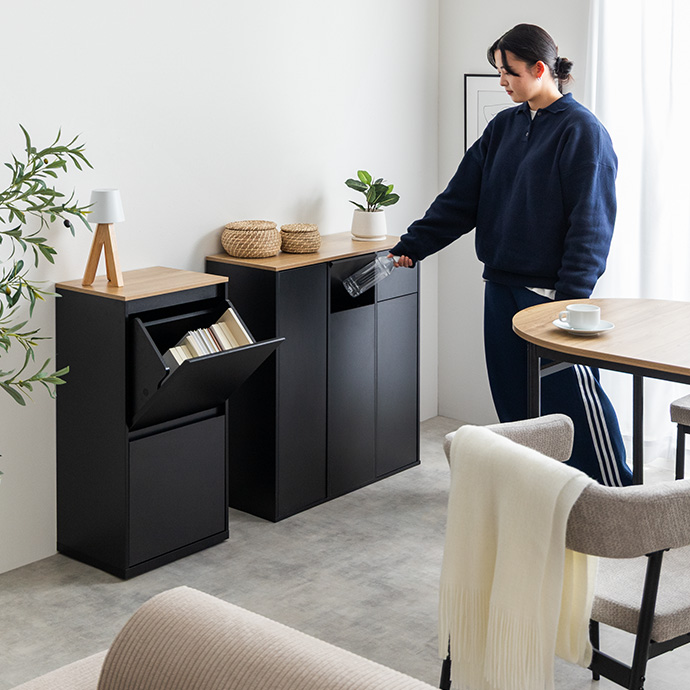 コンパクト設計ながら、二段構造でゴミの分別が可能。凹凸を抑えたフラットデザインで空間になじみ、スマートな印象を与えます。さらに、天板も自由に使える設計でデッドスペースをつくらず、見た目と機能性を両立しました。