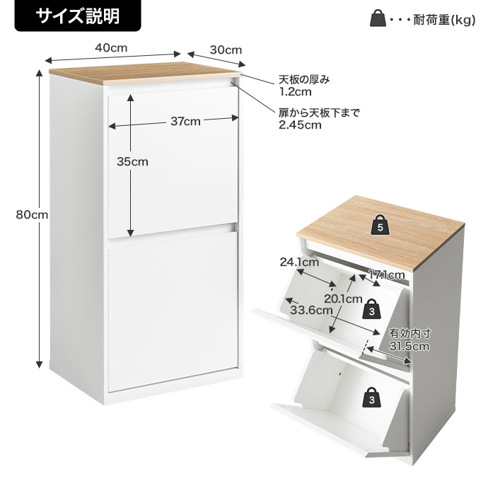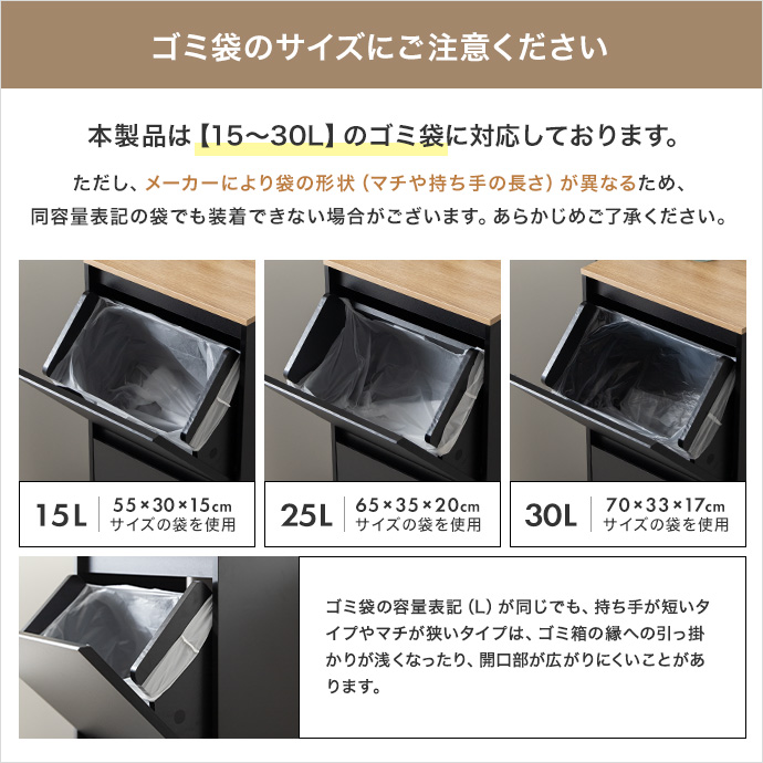 | 備考 | 【梱包サイズ】82.5cm×48.5cm×16.5cm 【梱包重量】約20.5kg 【商品重量】約19kg 【耐荷重】天板:約5kg、フラップ扉底板:(各)約3kg ※組み立て時間:2人以上で約90分 ※プラスドライバーをご用意ください。 ※15~30Lはゴミ袋サイズの目安であり、容積を保証する表現ではありません。 ※組立時に、電動ドライバーは使用しないでください。部材や部品が破損する恐れがあります。 【ORG】 |