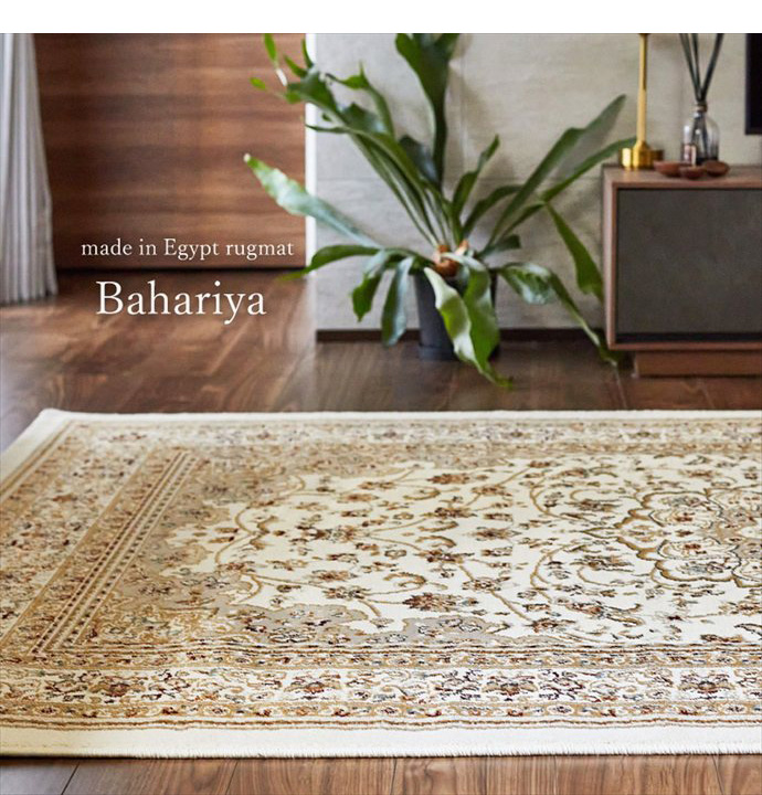 クラシック調の美しいデザインが、インテリアに華やかさを加える『Bahariya(バハレイヤ)』ウィルトン織ラグ。高密度に織り上げたパイルは耐久性があり、遊び毛も出にくいためお手入れも簡単。ヒートセット加工により、ゴミが入りにくく、長期間美しい状態を保てます。さらに床暖房やホットカーペットにも対応しており、オールシーズン快適に使用可能。シンプルな部屋にも上品なアクセントを加える一枚です。