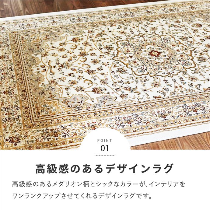 クラシック調の美しいデザインが、インテリアに華やかさを加える『Bahariya(バハレイヤ)』ウィルトン織ラグ。高密度に織り上げたパイルは耐久性があり、遊び毛も出にくいためお手入れも簡単。ヒートセット加工により、ゴミが入りにくく、長期間美しい状態を保てます。さらに床暖房やホットカーペットにも対応しており、オールシーズン快適に使用可能。シンプルな部屋にも上品なアクセントを加える一枚です。