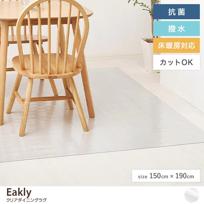 インテリアに溶け込むクリア素材のダイニングラグ。床面が透けて見えるため圧迫感がなく、お部屋の雰囲気を損なわずに床をしっかりと保護します。また抗菌・耐水性に優れたPVC素材を採用しており、お手入れ簡単。さらにハサミで簡単にカットできるため、必要に応じてサイズも調整可能です。約1.2mmの薄手設計で床暖房にも対応し、温もりを遮らず快適にお使いいただけます。