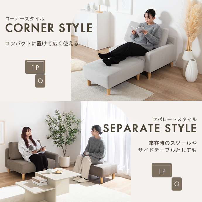 オットマンを組み替えれば、ワイド・カウチ・コーナー・セパレートと自在にアレンジ可能。お部屋の広さやライフスタイルに合わせて使い分けていただけます。また様々なスタイルに対応できるため、模様替えや来客時にも柔軟に対応可能です。