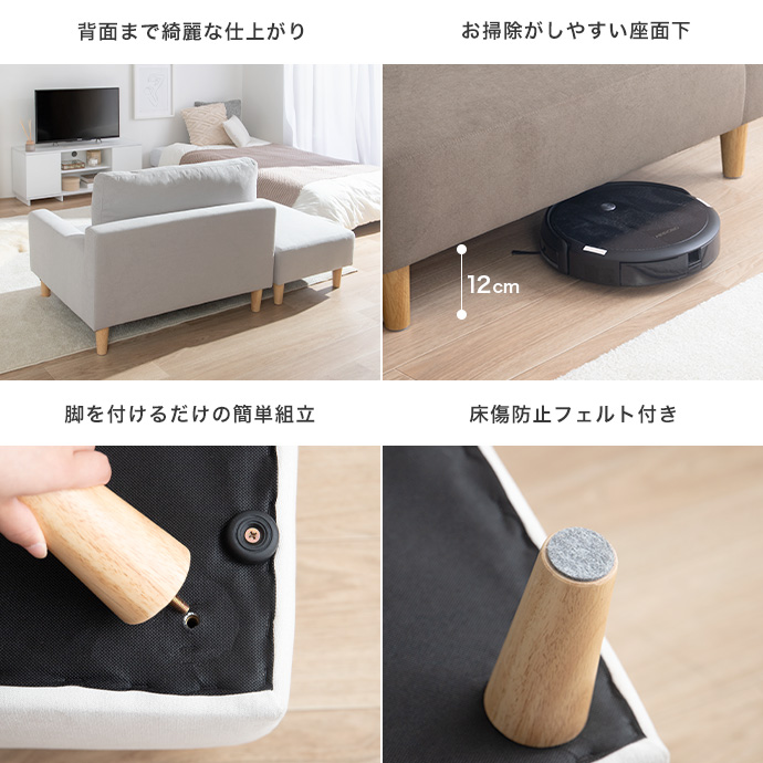 脚部は取り外しが可能。脚を外すことで気軽にフロアソファスタイルに変更いただけます。より床に近い状態で、リラックスして過ごしたい方におすすめです。また、ソファ底にはフロアスタイル専用脚が付いているため、床が傷付く心配もありません。