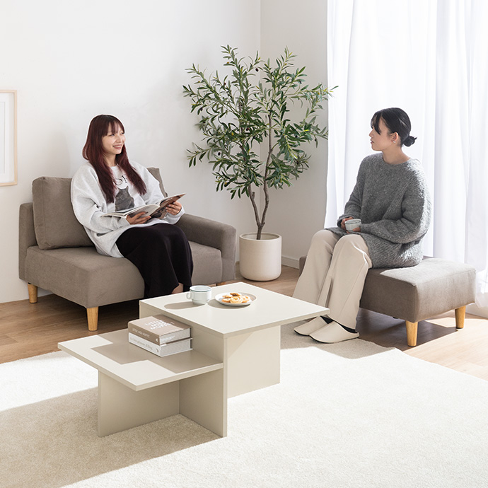ソファにプラスして足を伸ばせるよう座面幅を調節したり、単品でスツールのように使ったり、ちょっとした物を置くサイドテーブルの代わりとして使ったり。様々な幅広い用途でオットマンをお使いいただけます。