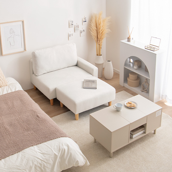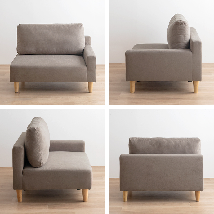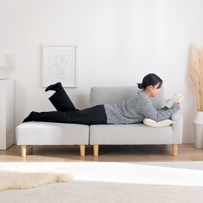 ワンルームや一人暮らしの方でも置きやすいコンパクトサイズに設計しました。窮屈さを感じにくい片側アームレスを採用し、幅が広く取れるため、コンパクトながら脚を伸ばしてゆったり寛ぐことも可能です。