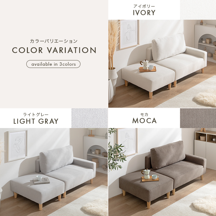すっきりと空間に馴染むコンパクトなカウチソファ。一人暮らしやスペースが限られたお部屋にも取り入れやすく、初めてのソファーとしても選びやすいサイズ感に。コンパクトながらも、ゆったりと腰掛けられる設計で、毎日のリラックスタイムをゆったりお過ごしいただけます。さらにオットマンを組み替えれば、シーンに合わせたレイアウトが可能。自分だけのくつろぎの空間をお作りいただけます。