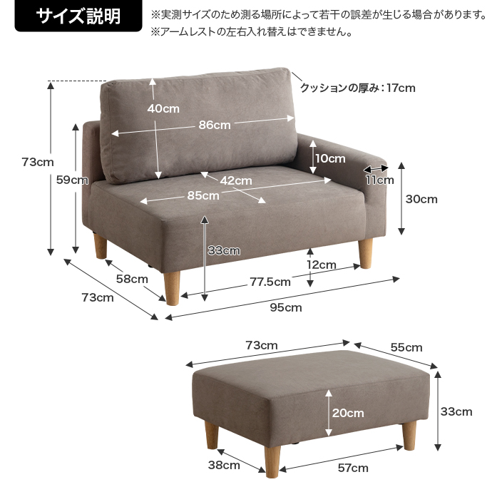 【ソファ】幅95cm×奥行73cm×高さ73cm(座面高:33cm) 【オットマン】幅55cm×奥行73cm×高さ33cm
