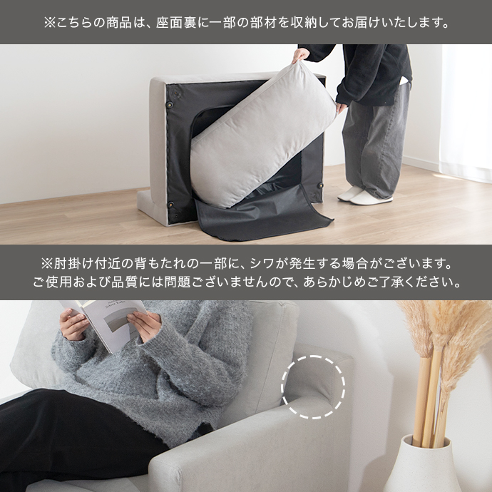 | 備考 | 【梱包サイズ】96cm×74cm×44cm 【梱包重量】約26kg 【商品重量】ソファ:約15.3kg、オットマン:約7.3kg 【耐荷重】ソファ:約100kg、オットマン:約80kg ※組み立て時間:2人以上で約15分 ※組立工具は不要。 ※製造工程上の理由により、肘掛け付近の背もたれの一部にシワが発生する場合がございます。ご使用および品質には問題ございません。仕上がりには個体差がございますので、あらかじめご了承ください。 【ORG】 |