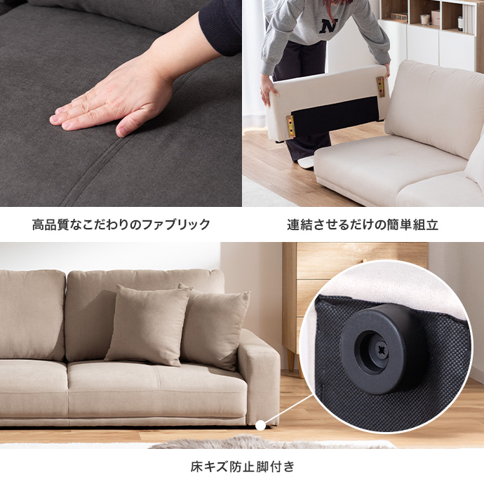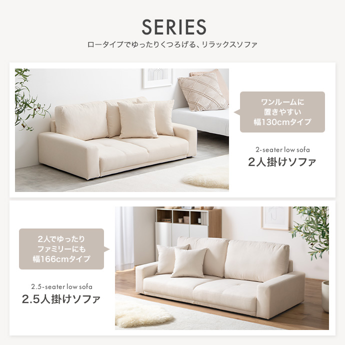 ベーシックなシンプルデザインで、部屋のテイストを選ばず取り入れやすい2.5人掛けローソファ。ゆとりのある座面幅で、2人で並んで座っても窮屈感がなく、自然と体を預けてリラックスした時間を過ごせます。また座面高を抑えたロー設計はお部屋に圧迫感を与えにくく、空間を広く見せながら、すっきりとした印象に。床との段差が少ないため、日常の動作も安心で、小さなお子様やペットのいるご家庭にもおすすめです。
