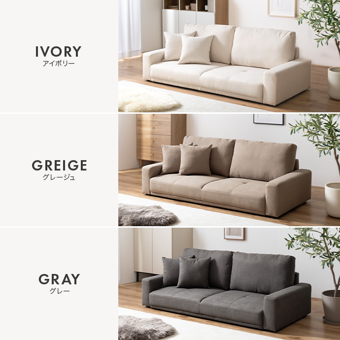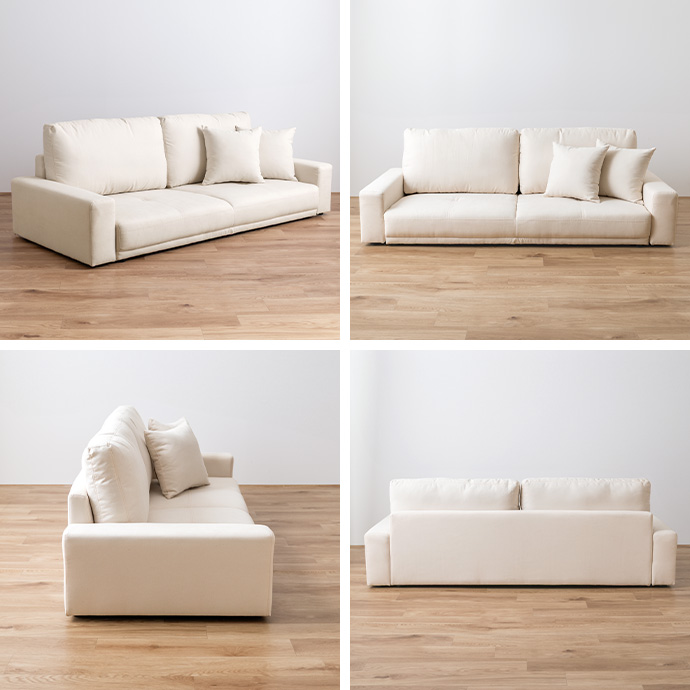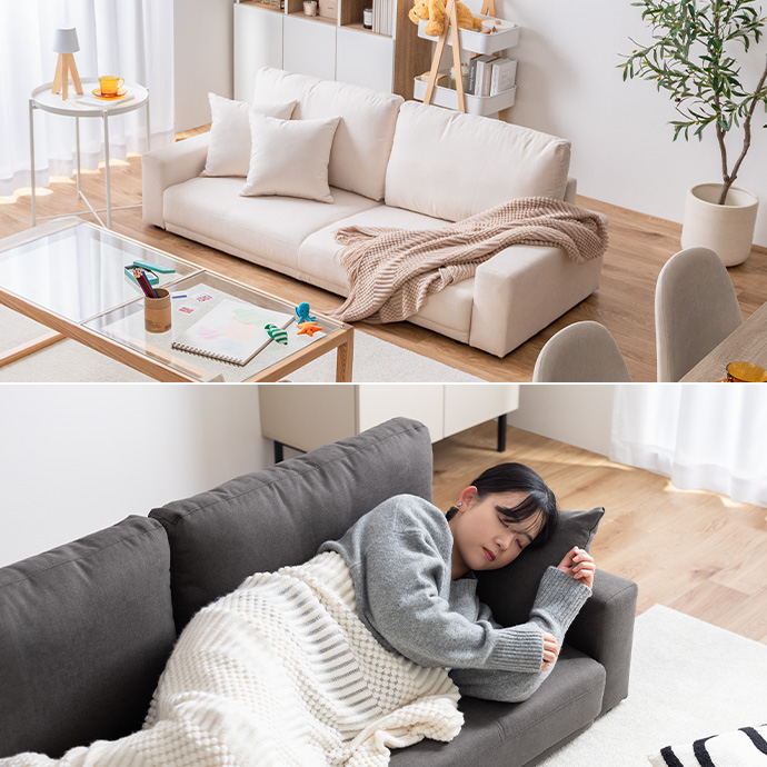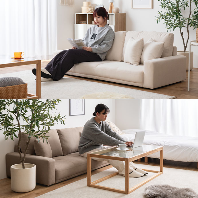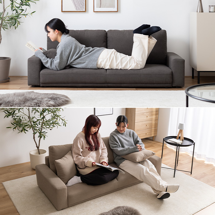 座面は幅137cm×奥行46cmと、深く腰掛けられるゆったり設計。足を伸ばしたり、横向きになったりと、リラックスした姿勢で過ごせます。底付き感のない程よい弾力の座面が身体をしっかり支え、長時間座っても疲れにくい設計に。座るときも、横になるときも、快適さが続きます。