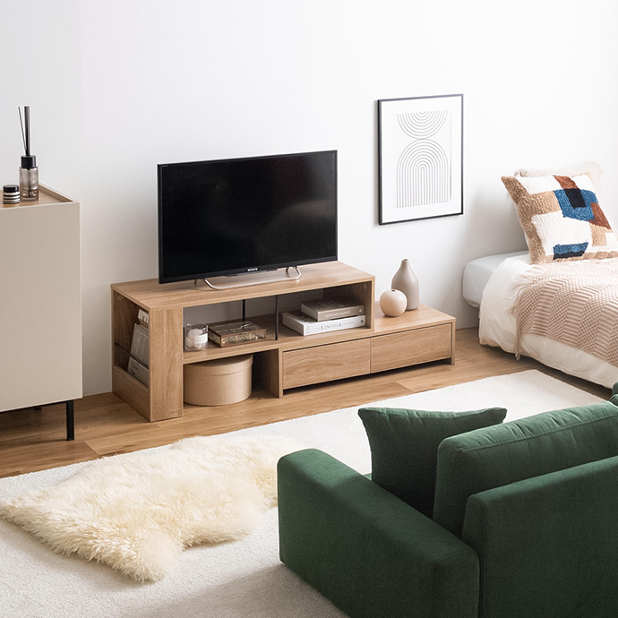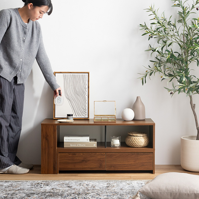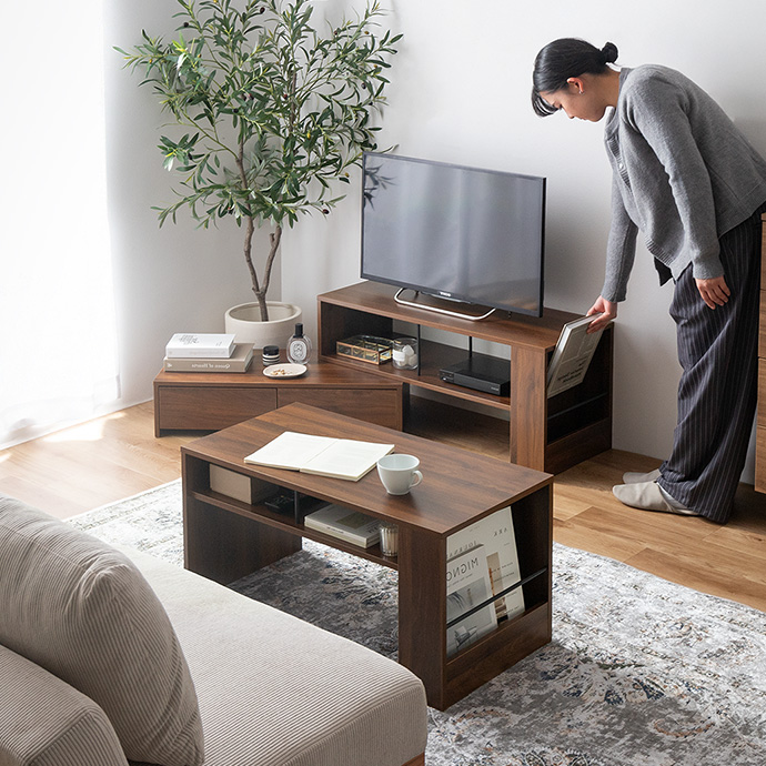 3つの収納スペースを備え付けたテレビ台。オープン収納、引き出し収納、マガジンラックと3タイプに分かれており、用途に応じて使い分けることで整理整頓がより快適に。ごちゃつきがちなテレビ周りをスッキリさせることができます。