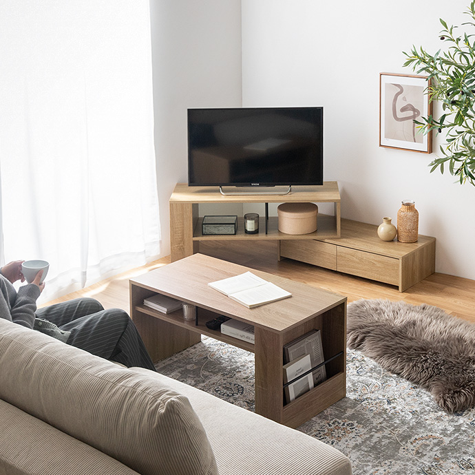 お部屋の大きさや間取りに合わせて自由自在にレイアウトできる伸縮テレビ台。セパレート式で横幅と角度の調節や左右を組み替えることもでき、お好きなスタイルを楽しむことが可能です。また、一人暮らしやワンルームにも置きやすいコンパクトデザインで、様々なお部屋に馴染みます。