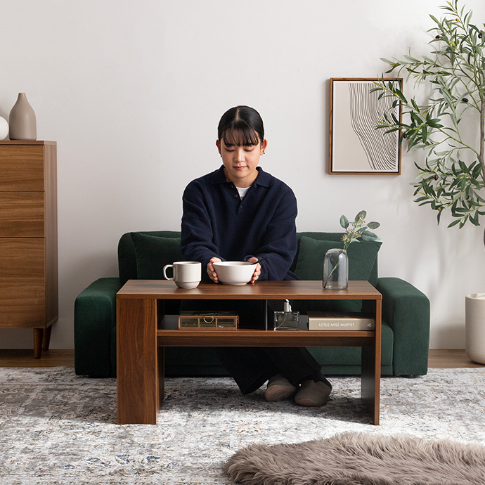 天板から床までの高さは40cm。ソファと組み合わせて使うのはもちろん、床に座って使うにも丁度いい高さです。棚下には足が入れられる設計で、床座りでも楽な姿勢でお過ごしいただけます。(※一般的なソファの座面高:38~42cm)