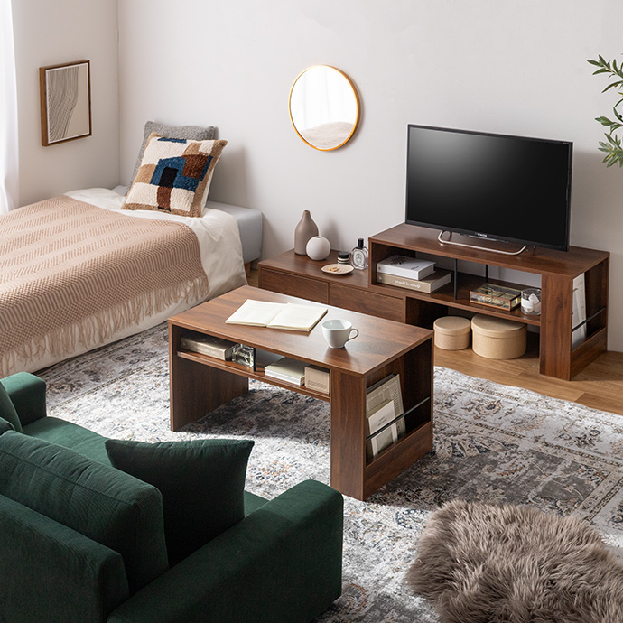 サイズは幅80cm×奥行40cm×高さ40cmとコンパクト設計。ロータイプで圧迫感を感じさせないため、ワンルームなどの限られたスペースにもすっきり置いていただけます。