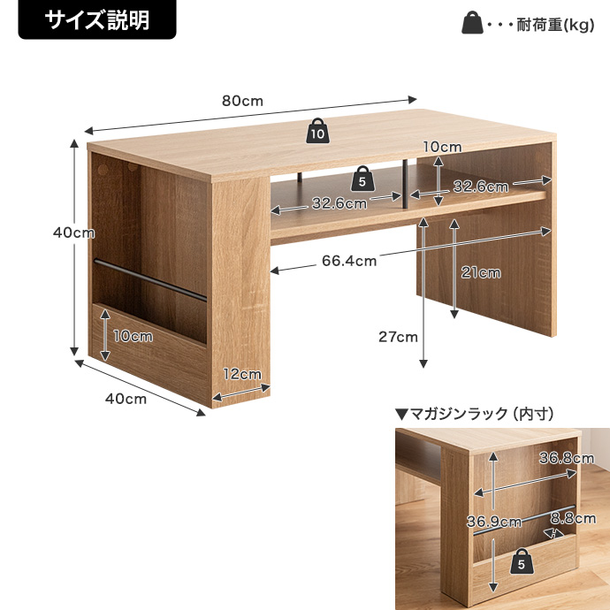 【耐荷重】天板:約10kg、オープン収納:約5kg、マガジンラック:約5kg