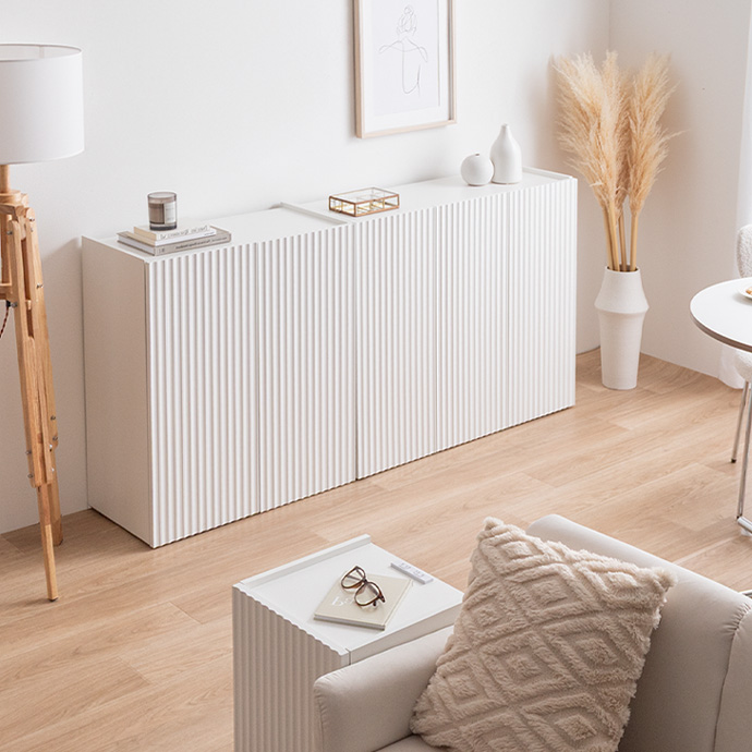 清潔感のあるホワイトと波型扉が魅せるキャビネット。お部屋に気品を添える美しいデザインは、主張しすぎない上品さで、海外インテリアや韓国インテリアのような洗練された空間を演出します。可動棚4枚付きの扉収納は、高さの異なるアイテムにも柔軟に対応し、背面のコード穴でルーター類も美しく収納可能。圧迫感のないサイズで、洗練されたデザインと実用性を兼ね備えています。
