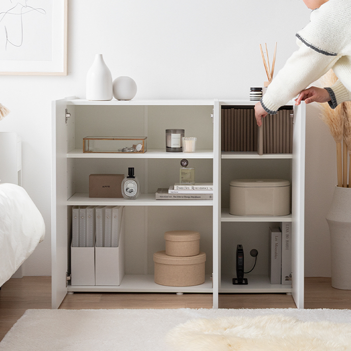 選べる幅70cmと幅95cmの2サイズ展開。シンプルなデザインのため、横に並べても圧迫感なくすっきりと収納力をアップいただけます。ワンルームからリビングまで、幅広いお部屋にフィットする万能キャビネットです。