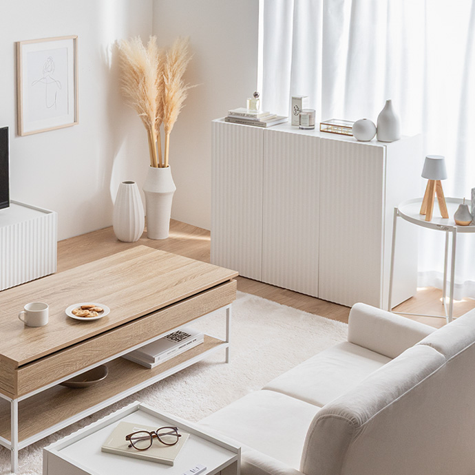 スリムなサイズながら、大容量の収納力を備えたキャビネット。リビングはもちろん、ダイニングや寝室、ワークスペースなど、あらゆる場所に置きやすく、様々なシーンで活躍します。