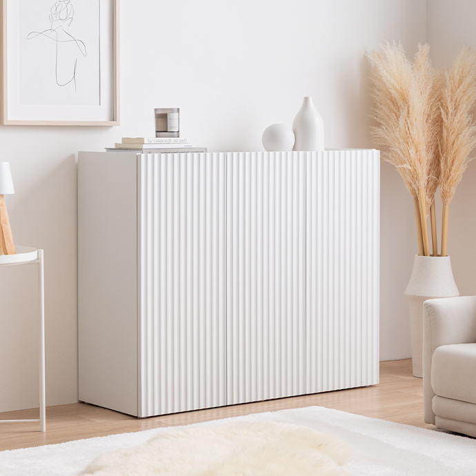 海外インテリアのような、波型扉が魅せるキャビネットが登場しました!清潔感あふれるホワイトに、やわらかな波型が美しい扉デザインを採用。また大容量の収納を備えており、ごちゃつきがちな小物類もこれ1台にまとめてたっぷりしまうことが可能です!見た目だけでなく使いやすさにもこたわった設計で、毎日の暮らしを快適に彩ります♪