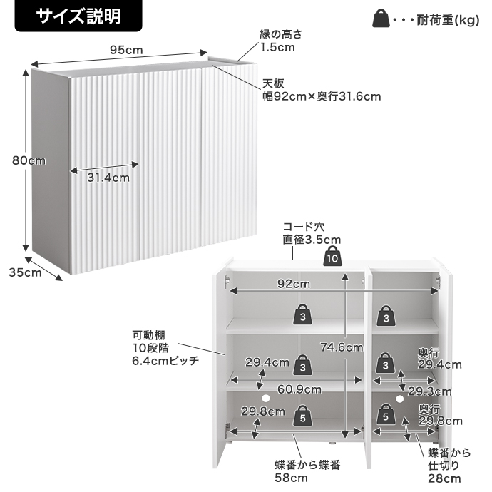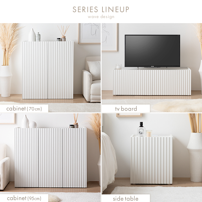 清潔感のあるホワイトと波型扉が魅せるキャビネット。可動棚4枚付きの扉収納は、高さの異なるアイテムにも柔軟に対応し、背面のコード穴でルーター類も美しく収納可能。圧迫感のないサイズで、洗練されたデザインと実用性を兼ね備えています。