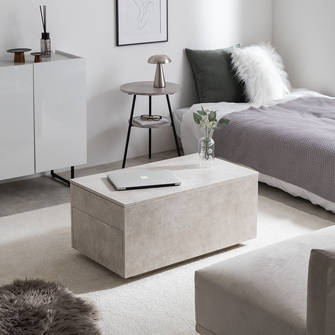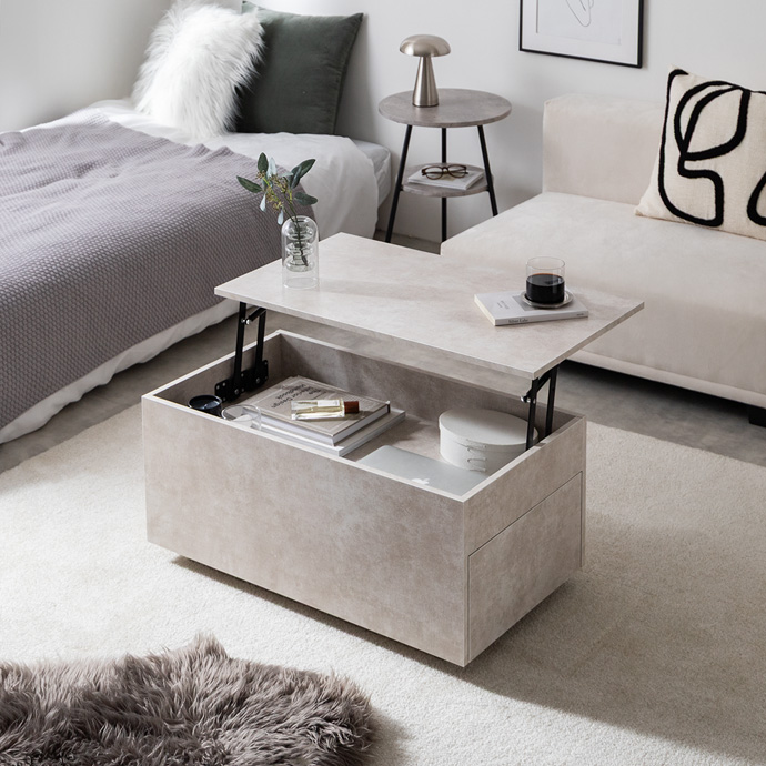 昇降式天板と収納力が揃った多機能センターテーブル。天板を上げれば、ソファに座ったまま手軽に作業ができるスペースになり、日々の食事、読書、メイク作業などを快適に。これ1台で様々なシーンに対応できる、便利なテーブルです。