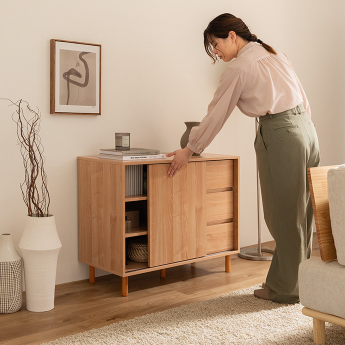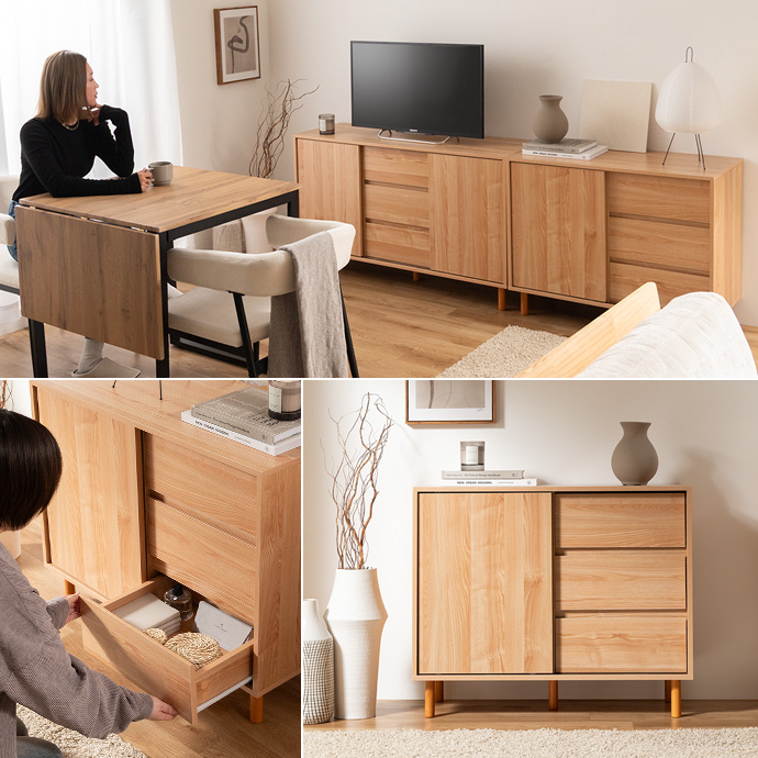 スタイリッシュな佇まいと大容量の収納力を兼ね備えたキャビネット。引き戸収納と3杯の引き出しで、日用品から小物まで生活感を隠して収納でき、天板と背面の配線設計により、コード類もまとめて整理可能。空間を整え、ワンランク上の上質な雰囲気を演出します。