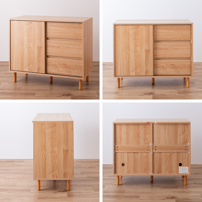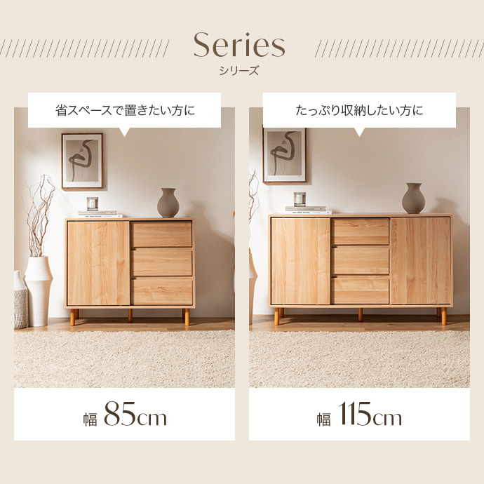 ノイズレスなデザインが際立つ、コンパクトな幅85cmキャビネットが登場しました!一人暮らしのお部屋や、リビングの空きスペースに置ける絶妙なサイズ感が魅力です。引き戸&3段引き出しで収納力もばっちりです!