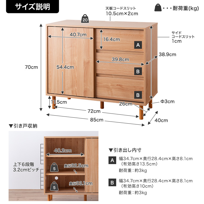 【耐荷重】天板:約20kg 、可動棚:約5kg 、扉収納内底板:約5kg、引き出し:約3kg