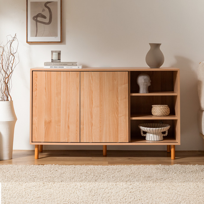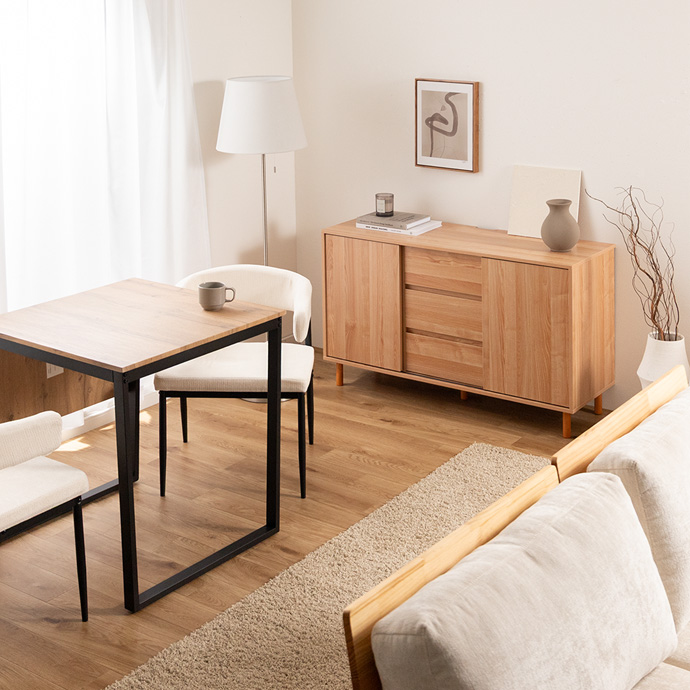 美しい木目と直線的でノイズレスなデザインが、空間をぐっと引き締めます。天然木の脚部がもたらす軽やかな抜け感と、木目を活かしたナチュラルな色味が調和し、穏やかで落ち着きのある上質な空間を創り上げます。