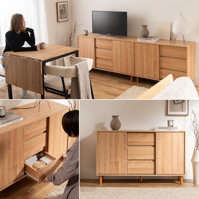 スタイリッシュな佇まいと大容量の収納力を兼ね備えたキャビネット。引き戸収納と3杯の引き出しで、日用品から小物まで生活感を隠して収納でき、天板と背面の配線設計により、コード類もまとめて整理可能。空間を整え、ワンランク上の上質な雰囲気を演出します。