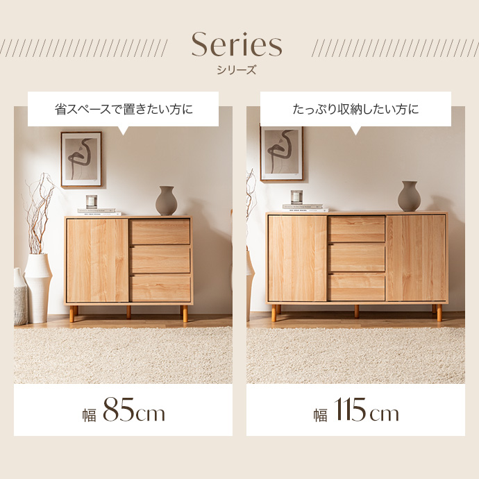 ノイズレスなデザインが際立つ、幅115cmキャビネットが登場しました!引き戸&3段引き出しの大容量収納により、小物類からA4書類もまとめて隠せるのでリビングの生活感も一気に解消。ハイタイプのテレビ台としての利用もおすすめです♪