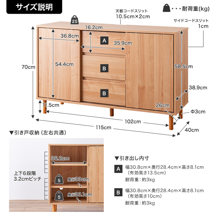 | 商品名 | 【幅115cm】引き出し付きキャビネット |