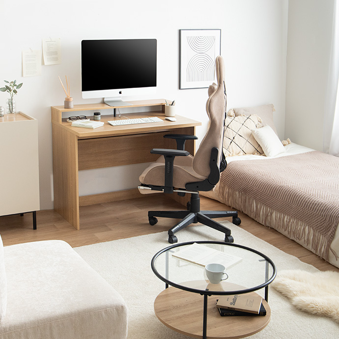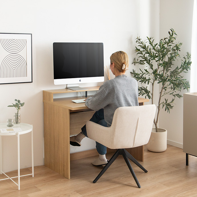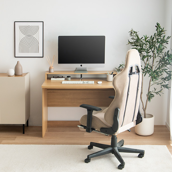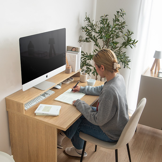 天板と同じ幅で設けたモニター台付きのデスク。モニター台があることで天板を広く使え、キーボードやノートを広げてもゆとりをもって使えます。また、モニターを目線の高さに置けるため、首や肩・腰への負担を軽減し、長時間のデスクワークや勉強も快適に。さらに配線や電源タップもすっきり収まり、デスク周りをきれいに整えられる設計です。在宅ワークや勉強、趣味の作業など、日々のデスク時間を心地よく支えます。