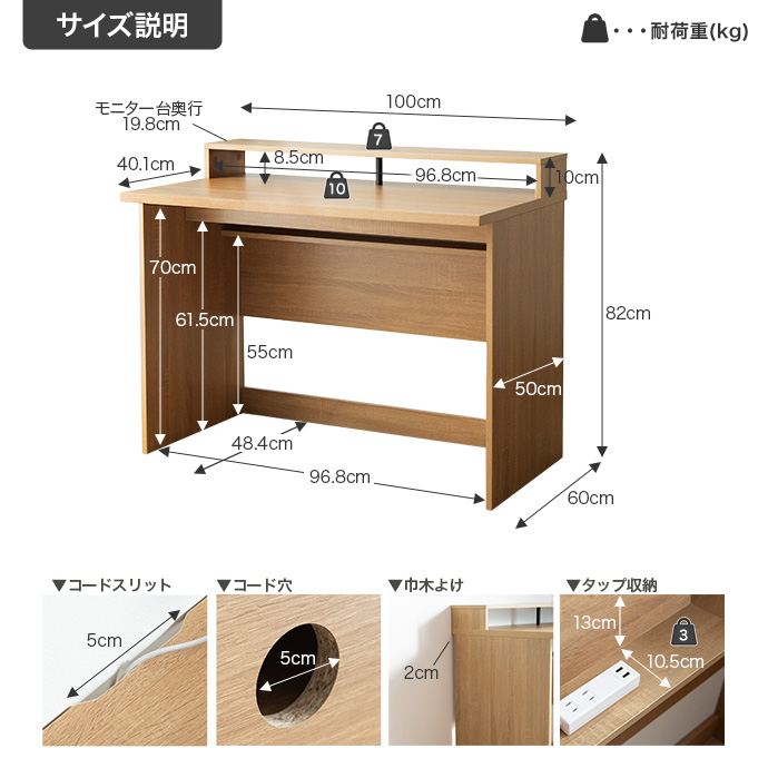 耐荷重 【天板】約10kg、【モニター台】約7kg、【タップ収納】約3kg