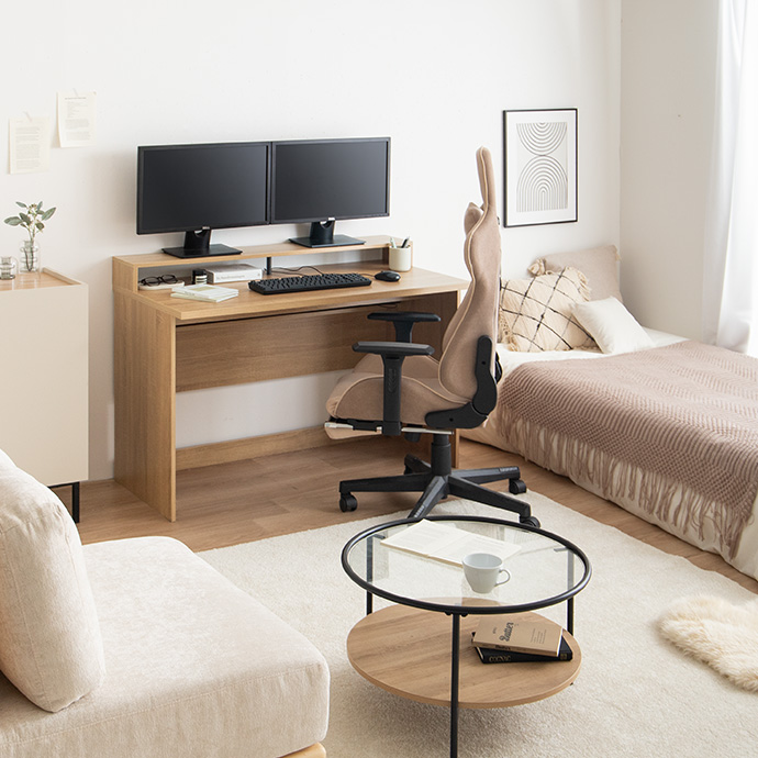 天板と同じ幅で設けたモニター台付きのデスク。モニター台があることで天板を広く使え、キーボードやノートを広げてもゆとりをもって使えます。また、モニターを目線の高さに置けるため、首や肩・腰への負担を軽減し、長時間のデスクワークや勉強も快適に。さらに配線や電源タップもすっきり収まり、デスク周りをきれいに整えられる設計です。在宅ワークや勉強、趣味の作業など、日々のデスク時間を心地よく支えます。